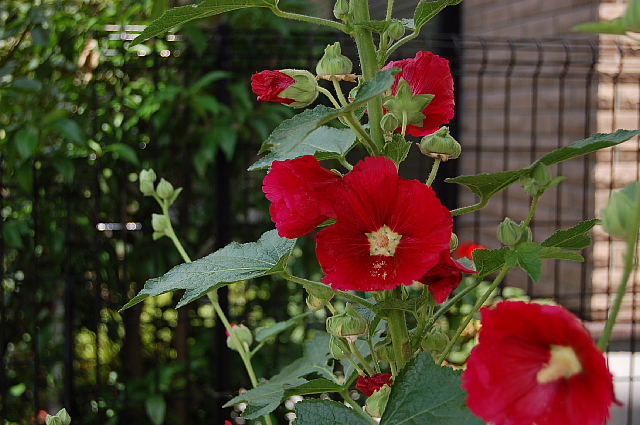 開花時期は、5/末~8/末。梅雨時に咲くので、別名(つゆあおい)とも呼ばれている。江戸徳川家の紋所としても有名である。我が家の片隅に蒔いた種が発芽し、驚くほどの早さで人の背丈より遙かに大きくなった。多くの蕾が次々と開花した。花弁は大きく、深みのある濃い赤は、何故か、気位の高さを感じる。しばらくの間楽しめそうだ。