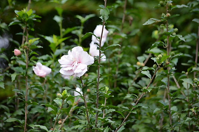一般的に知られる葵と呼ばれている木にも、色々な種類がある。写真の絵は、アオイ科、フヨウ属、ムクゲと呼ばれているらしい。朝に花が開き、夕方にはしぼんで、次の朝に開くと言うかたちで開花する。写真の絵は、ムクゲ八重咲きの一種らしいが、無学花音痴の老輩、その真偽は定かでない。どなたかのご教示を切望する。