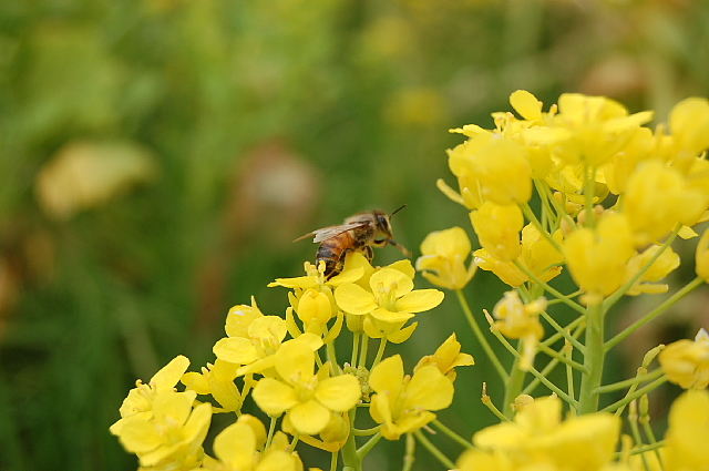 鮮やかな緑の葉に、黄色い可愛い花がよく似合う菜の花。さっと湯がいて食べると、季節を丸ごと味わえる。若い頃はあまり有り難いとは思わなかったが、年だね、何とも美味しいね。蜜蜂がせっせと密集めの仕事に精を出している。あまりにも多い花の数に、何処が良いのか迷っている飛び方をしている。柔らかな新芽を一杯摘んで、蜜蜂たちと別れた。